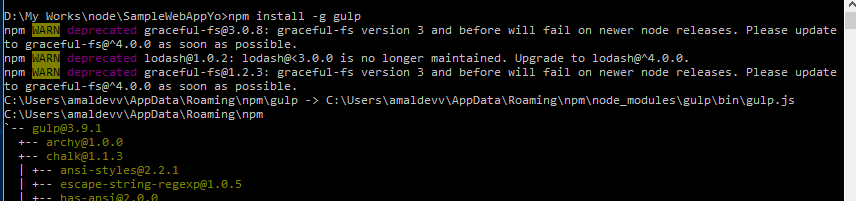 We will be using Node Package Manager or npm to install Gulp globally in the system. So use the command below to start the installation
