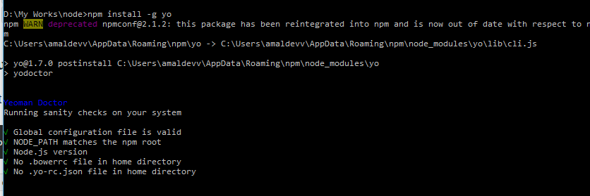 Along with Node.js some other utilities will also get installed during the installation of node and one of them is Node Package Manager or npm. For installing Yeoman, npm is needed because Yeoman is being delivered as node package.