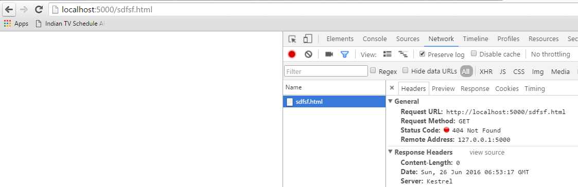 Let's create a empty MVC project and run the application using the dotnet run command. It will self host the application and exposes port# 5000 for accessing the site. Open the site in the default browser by typing in http://localhost:5000/ and if you try to access a page which doesn't exists in the project, the browser will show an empty page or a page with a message saying that Page not found. Given below is the screenshot of the page I got in Chrome. If you open up the developer tools by pressing F12, you can see that the response from the server has 404 as status code.