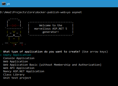 When this command is executed, Yeoman will list the available options as shown in the image below.