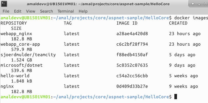 It will pull the latest image from the hub if it's not found in your local docker client and once the download is completed we can verify the same by executing the docker images command. I had downloaded the image some time back and you can see that in the below screenshot as the last item in the list.
