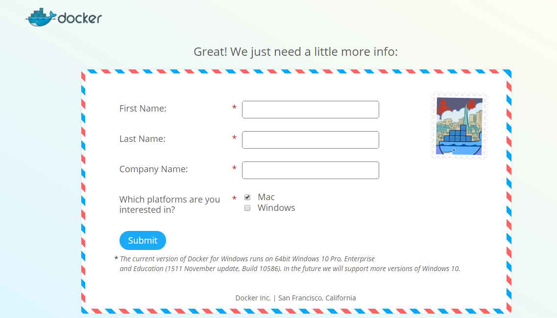 This is a limited beta program from Docker and is not open to all. First you need to go to beta.docker.com and sign up using your Docker ID. Once you are successfully validated, you are redirected to a page where you can fill up the information as shown in the below screen grab.