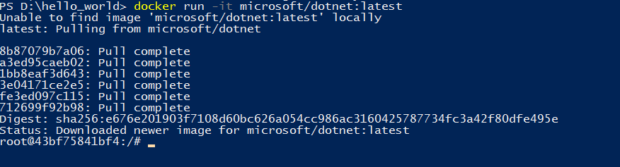 It will pull the latest version, that is RC2 in our case from the repository and once it completes the download you will get a bash shell prompt, from where you can execute the CLI commands. You can refer the Microsoft repoository in Docker to know about more options such as downloading a specific version etc.