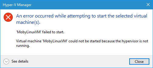 When I started the Docker again, the above error went away but got another one this time saying that the VM cannot be started because the hypervisor is not running.