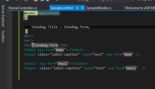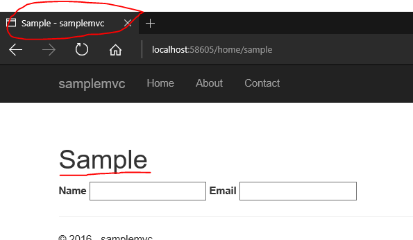 After saving the file go and modify your cshtml to add a new heading to show the title and also set the ViewBag.Title property which is used in your layout page to show the title.