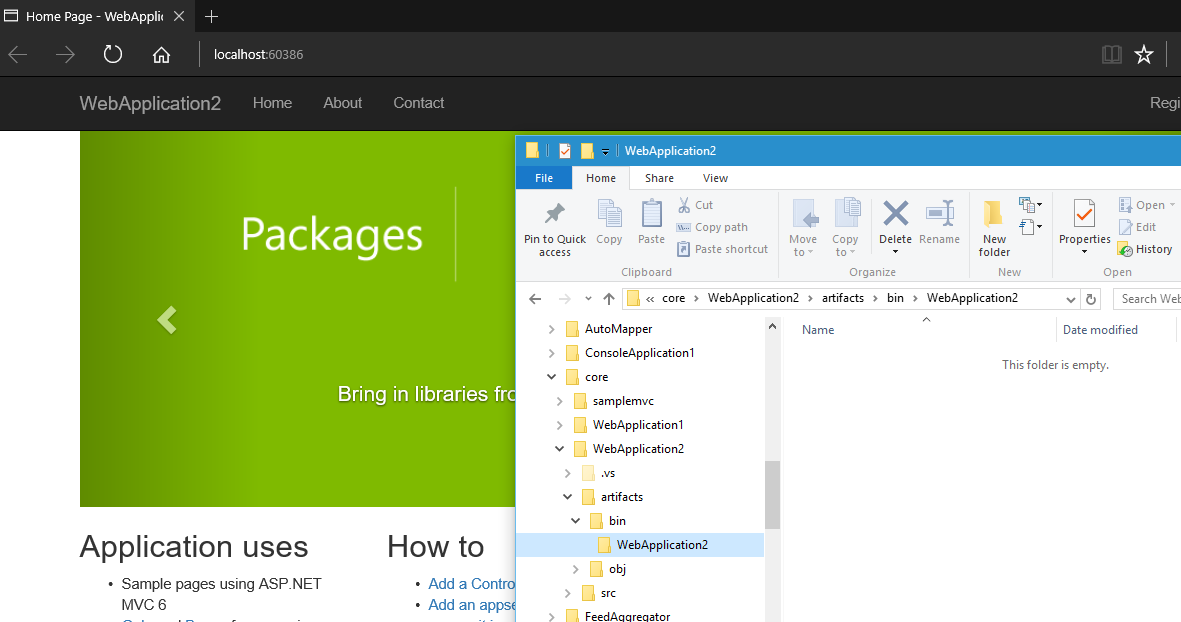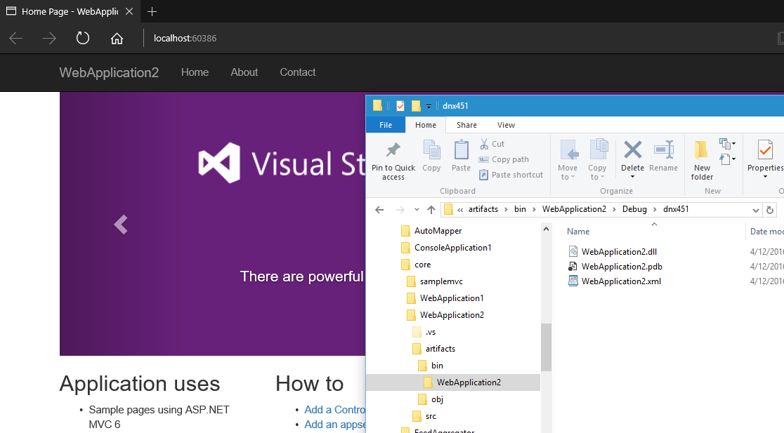 So let's hit F5 and the site will get opened in the default browser. In MVC 6 the bin folder has been moved out of the root directory and it now resides in the artifacts folder in the project directory.