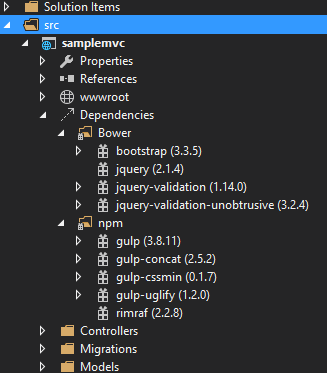 Apart from these we will making use of different types of client side libraries like jQuery, Kendo, Angular etc. In MVC 6 all of it are placed under the dependencies folder. Managing client side frameworks is more tedious when compared to the server side cousins and two of the great names in open source package management is now supported in MVC 6. Bower and npm packages will be listed under the Dependencies