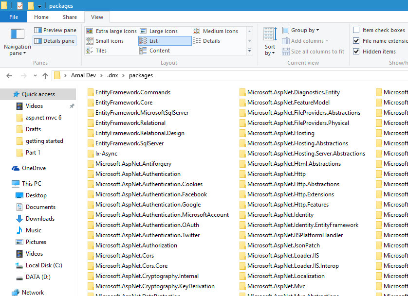 In the earlier versions, we use NuGet package manager to download numerous libraries and asseblies for the various projects in the machine. All there are stored in the packages folder in the project itself. So you machine has got copies of same package in different folders which is actually wasting the disk space. In MVC 6 the packages are stored in a central location there by reducing the size used in disk considerably. The new location is under the .dnx folder in the Windows users folder.