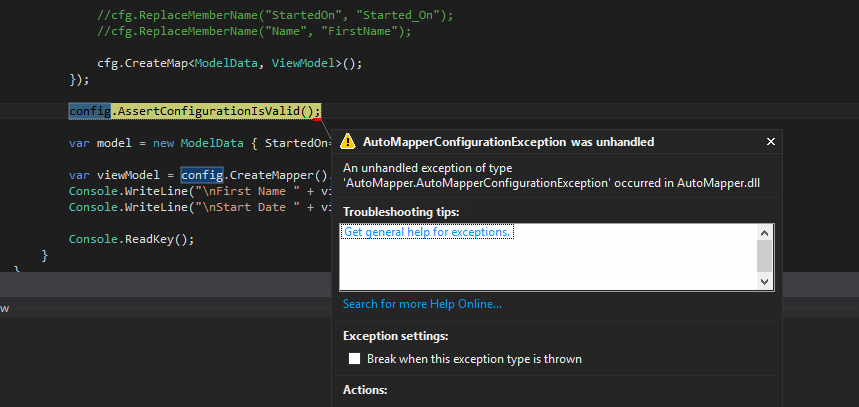 The AssertConfigurationIsValid method is used to verify all the configuration is valid or not. If it's not then an exception will thrown then there otherwise it will be thrown at the time of mapping itself. Normally we are doing the configuration during startup and it's good practice to to use this method there. Suppose if comment out the ReplaceMemberName methods in the configuration, you will get an exception like this.