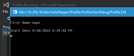 Here we are doing couple of replacements, one for adding a underscore to Started_On property and second one for completely using a new name for the property. One thing to note here is that you should specify the replacements before the CreateMap statement otherwise it will you invalid mapping exception at runtime.
