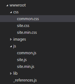 So we have sucessfully completed the bundling and minification process as shown in the above image. If you look at the screnshot closely you can see that when the css files are processed only bundling was done and in the case of JS files, both bundling as well as minification was done. This was due to the configuration we have in the bundleconfig.json which disables minification for css files. If you look in the folder structure you can see that two new files are created in both the js and css folders. Those files site.min.css and site.min.js were created during the bundling operation using the configuration from bundleconfig.json file.