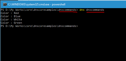 A command contains two parts, the name for the commands is given on the left side and right contains the arguments needs to be passed to the command. In our configuration RunSample is the name of the command and we are passing the name of the folder which is "dnxcommands" to the command. When you pass the name of the folder, make sure that proper casing is maintained, because if there is mismatch in the casing it will return an error.