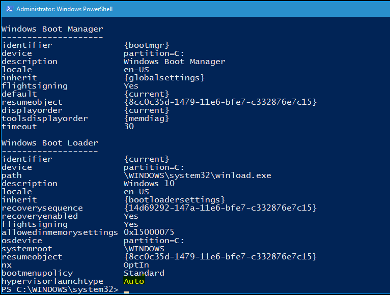 If it's setup properly, then it will have an entry called hypervisorlaunchtype with value set to auto or on. If it's missing, then add it by executing the following statement.