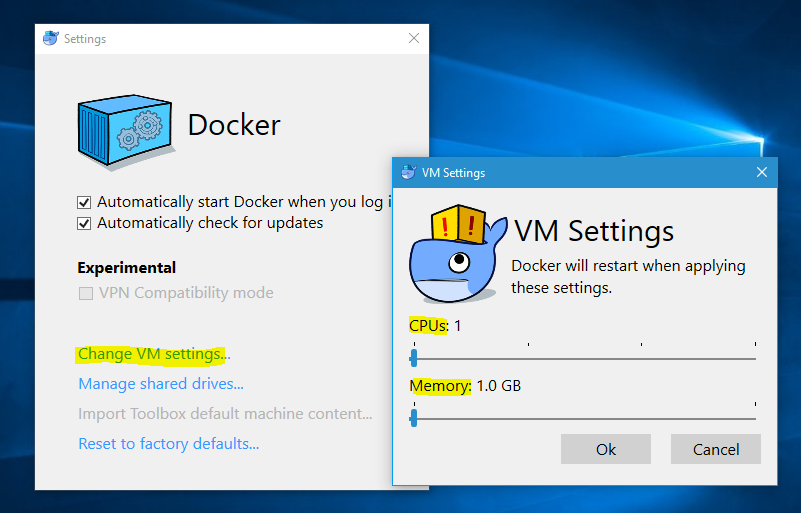 In the context menu itself, there is a menu item for Settings, which will open a dialog window from where you can configure properties such as Change VM Setting, Manage Shared Drive etc. In the Change VM Settings window, you will have the options for specifying the number of CPUs as well as the amount of RAM that will be used by VM. For me it was 2 CPUs and 2 Gigs of RAM by default and from the log I found out that I can assign only 1.8 gigs. Now I understood the error raised by Docker and so I scaled it down to 1 CPU and 1 GB as shown in the image below.