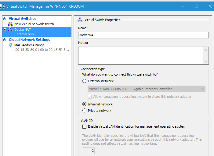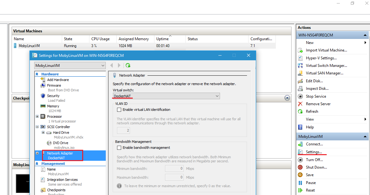 With these steps, I finally got rid of the failed to initialize errors, but now I was getting couple of errors related to connectivity. When I checked the VM in Hyper-V, I can see that it's using the DockerNat as the network adapter, but no IP address were getting assingned. The entries in the log were