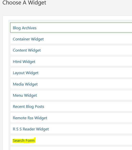 When you click on the Add button, it will navigate to a page, from where you need to chose the Search Form from the listed widgets.