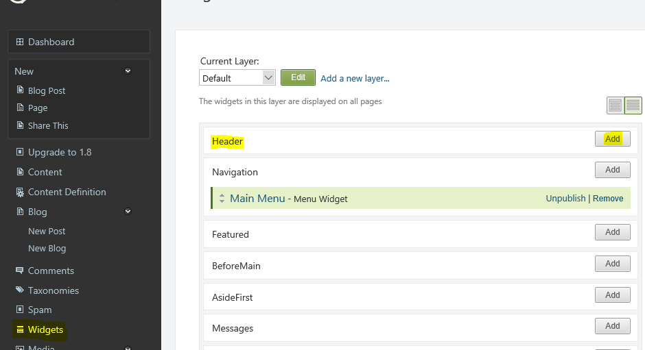 To show the search box in the UI, you need to add it to the page which can be done from the Widgets section. Click on the Widget to naviage to the page where it will display the layout of our page. Select Default from the Current Layer drop down and then click on the Add button in the Header to add the search widget.