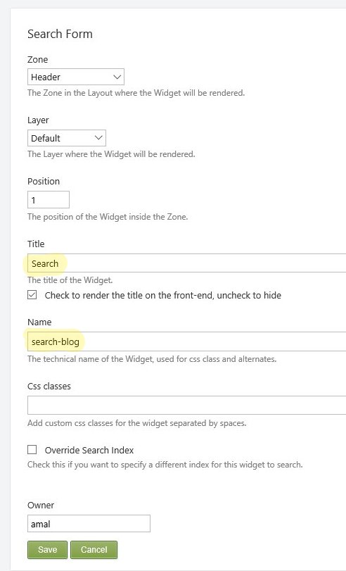 When you click on the Search Form widget, you will taken to the configuration page where you need to give a Title and Name which are mandatory along with other options for Zone and Layer