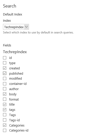 Now, you will need to specified the fields that can be used for querying in the index. For that go to Search page by clicking on the Search link under Settings from the left menu. Select the newly created index from the dropdown and select the fields which you want to include as shown below.