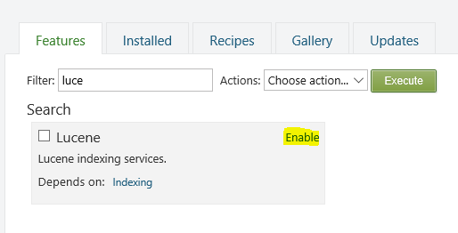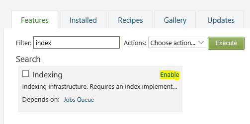 To enable it, go to Modules and search in the Filter box in the Features tab as shown below. If the module is installed then it will show there, otherwise you need to install it first. Clicking on the Enable link to make it available in the site.