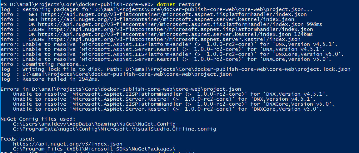 To compile and host the web application, first you need to restore all the dependencies mentioned in the project.json file. For that we can use the dotnet restore command as shown in the image below.