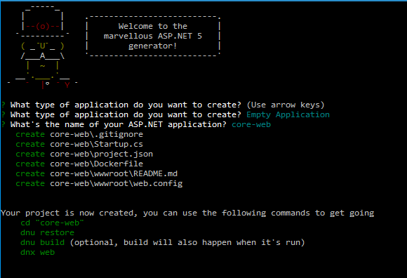 Since the template used by Yeoman is based on .NET Core RC 1 we needs to do some modifications in these two files so that it compiles and executes successfully in RC 2. You can refer this link for the modification needed when converting from RC 1 to RC 2