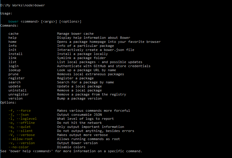 You can confirm whether bower is installed correctly or not by running the statment below. It will output the help for the bower to the console