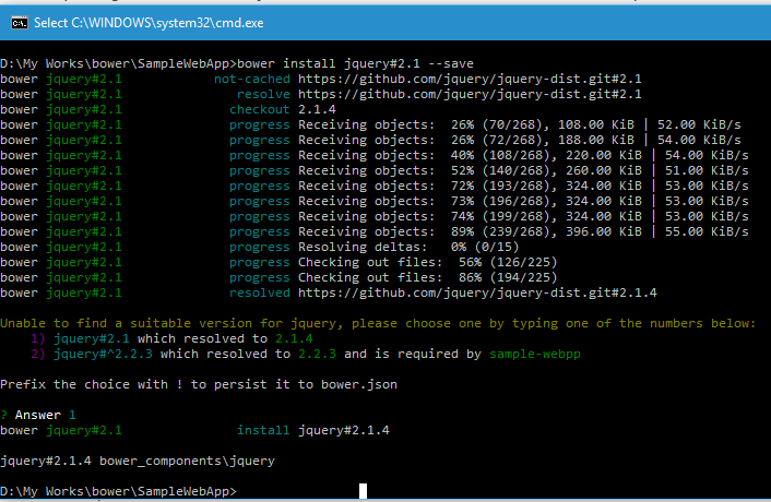 If the specified version number is not found, bower will some suggestion based on our selection as shown below.