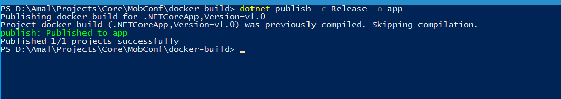 So in the dockerfile we have specified that our library is in app folder and we haven't one that yet in our project till now. Let's create that using the dotnet publish command as shown below.