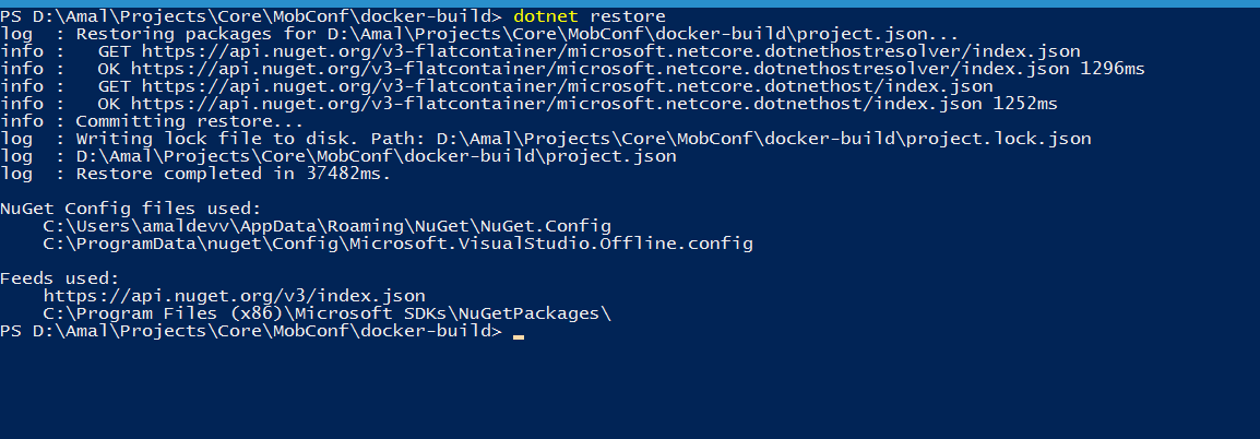 We will now first use dotnet restore command to first restore the dependencies mentioned in the project.json file and then use dotnet build to compile the source code.