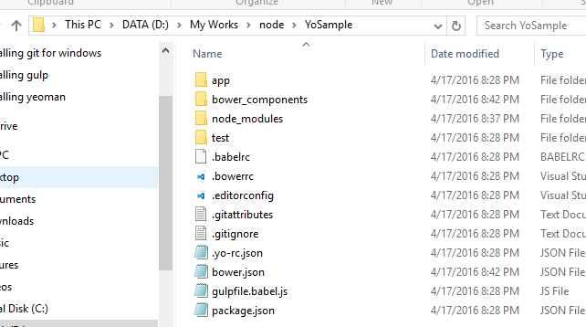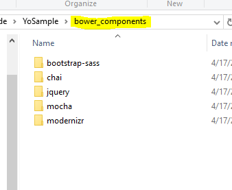 Once the execution is completed, you can see the folders and files being created inside our root folder. And if you inside the bower_components folder, you can see all the packages used by the project there.