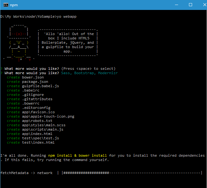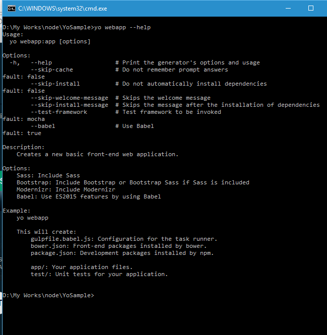 This will install the webapp generator globally and if you run the yo --generators command, it will list the newly added generator. Now let's create a folder for our project and run the following command from the root folder of your project to scaffold items.