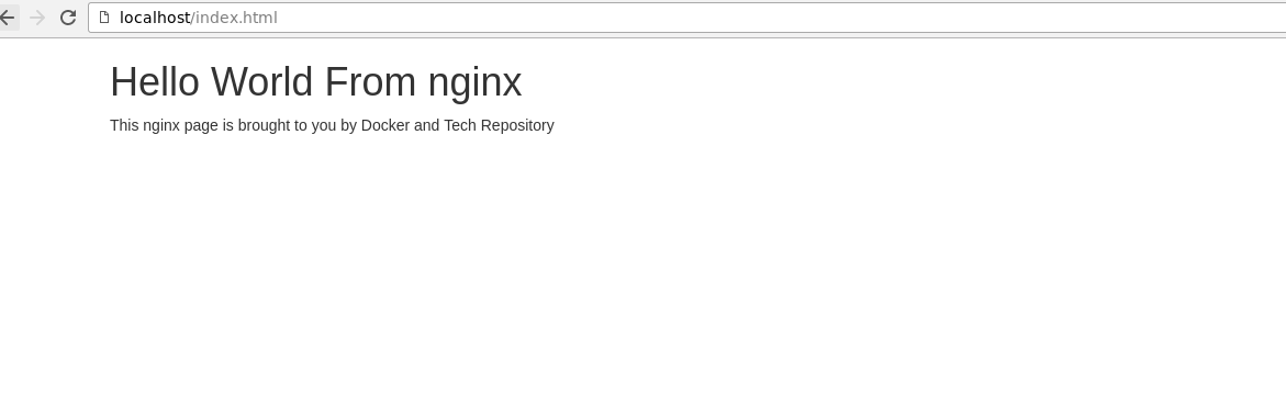 To access the file, fire up up the browser in your local machine and type http://localhost/index.html and you will get the static file which we had created earlier served by nginx. So what has happened here is that since the http uses port #80 by default, Docker client will see this request and since we have specified the mapping while executing the docker run command it will redirect the traffic into the port #80 in the container which we created in Step 4. The nginx server is listening in the port #80 inside the container will pick up this and returns the index.html as response to the Docker Client who will subsequently send that to the browser.