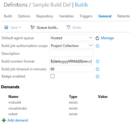 In the demands section, we can specify the pre-requisites for the build. In our case we need to have msbuild and visual studio installed on the build agent. So whenever a build happens, it will first assert the ones specified in the demands and will continue the process if and only if it's passed the assertion successfully.