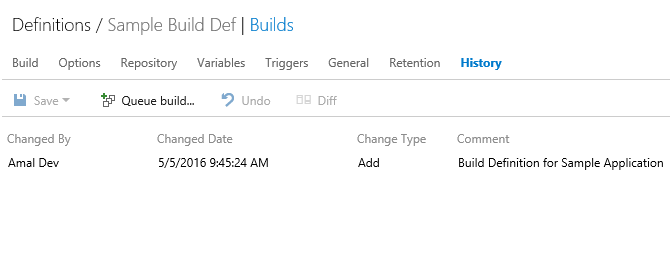 The History tab will list all the revisions made to the build definitions with details such who made the changes and when. Also you will be able to view the difference between two entries by selecting both and chose Diff option to see the changes.