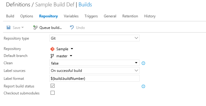 While starting the build process, the agent will download the files from the remote repository to a local directory and starts the build from there. Here you specify the repository and the branch from where the source code needs to be downloaded. Also, there are additional options like to clean the solution before building as well as option to apply the label to tag the files used in the build etc