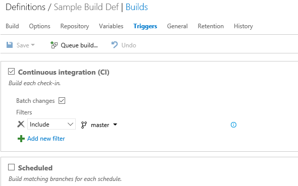 Another option is to specify the branches that needs to be used for the build. In certain scenarios you may want your core branch as well as the feature branch needs to be triggered for build, you can use these options for that.