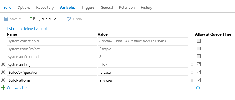 You can click on the lock icon to make a value as a secret variable. Then the actual will be masked and will be stored as encrypted. This feature comes in handy when you want to define a password in the variable list and doesn't want to expose the value to all who has got access to build definition.