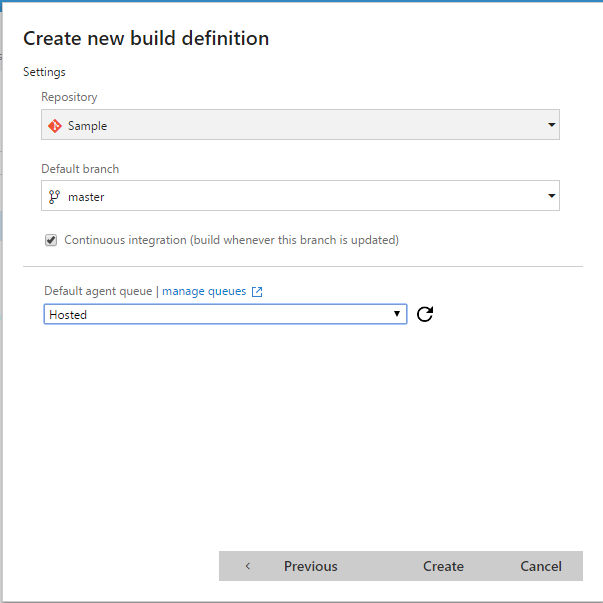 In the Create New Build Definition window, select the repository and the branch you want to build and also don't forget to select the checkbox for Continous Intergration otherwise build won't be triggered when you do a check in. Select Hosted as the default agent and click on Create button