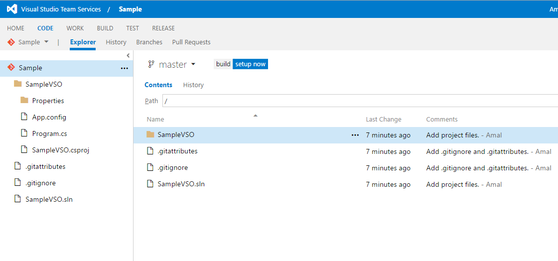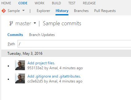 In the Explorer tab, it will list all the checked in files as shown below. You may recollect that while creating our online repository, it was empty and now it has the solution which we pushed from the command prompt and the complete history can be viewed from History tab