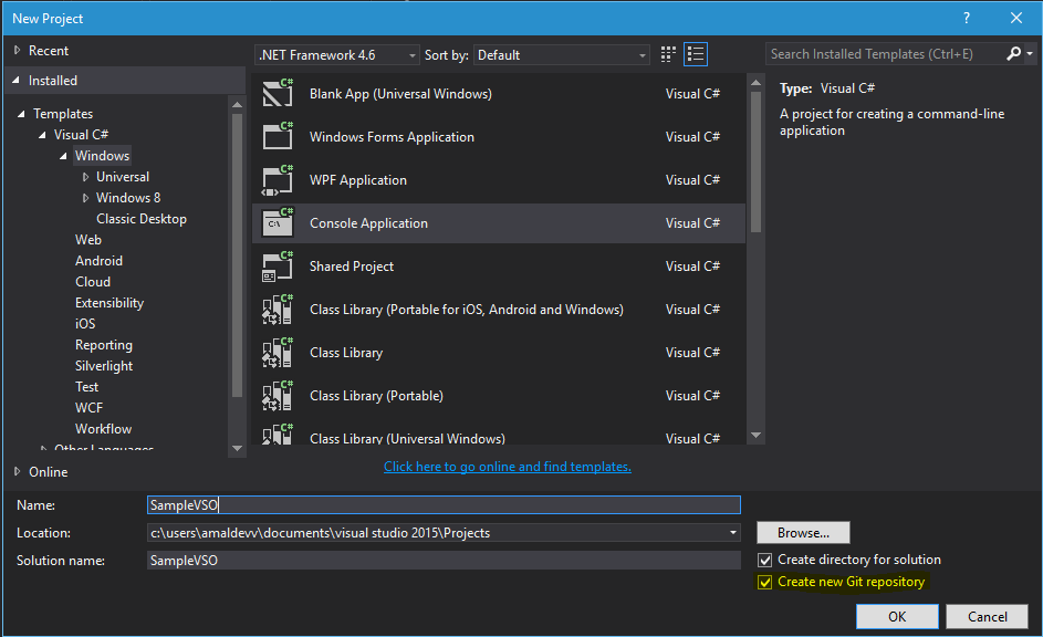 Let's create a sample console application in Visual Studio from File -> New Project. Make sure that you select the Create New Git Repository option while creating it as shown in the below screenshot