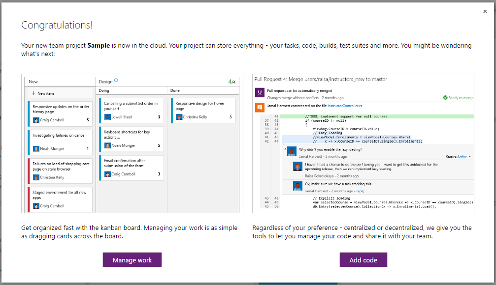 Clicking on the Navigate to project will show a modal dialog window, where you will have two options. One is for managing the work and other is for adding code. Let's add code to our repository by clicking on the Add Code button.