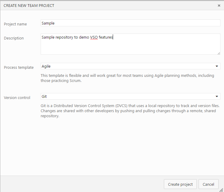 Give a name and description for the project in the modal window, select Git for version control and process template as Agile and click on the Create New Project button.
