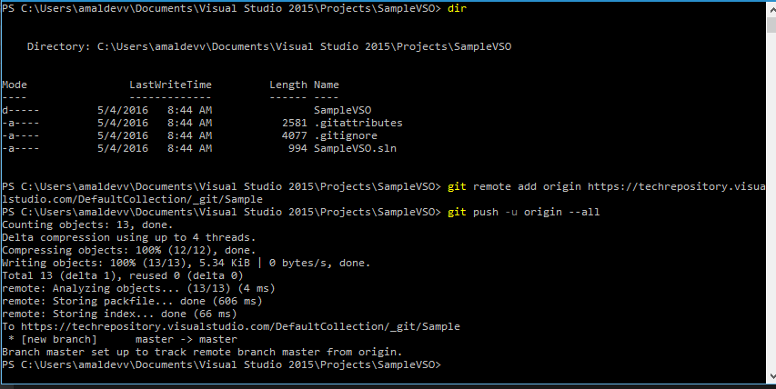 Instead of using the command prompt, you can use the Team Explorer window in Visual Studio to publish it to the online repository. I will be blogging about in another upcoming post, till then happy coding/