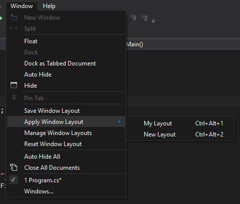 Another neat little feature available in Visual Studio is the option to customize the window layouts. This comes in handy when you work on different machines and you want the same look and feel for the enviroment across all your devices and instances.