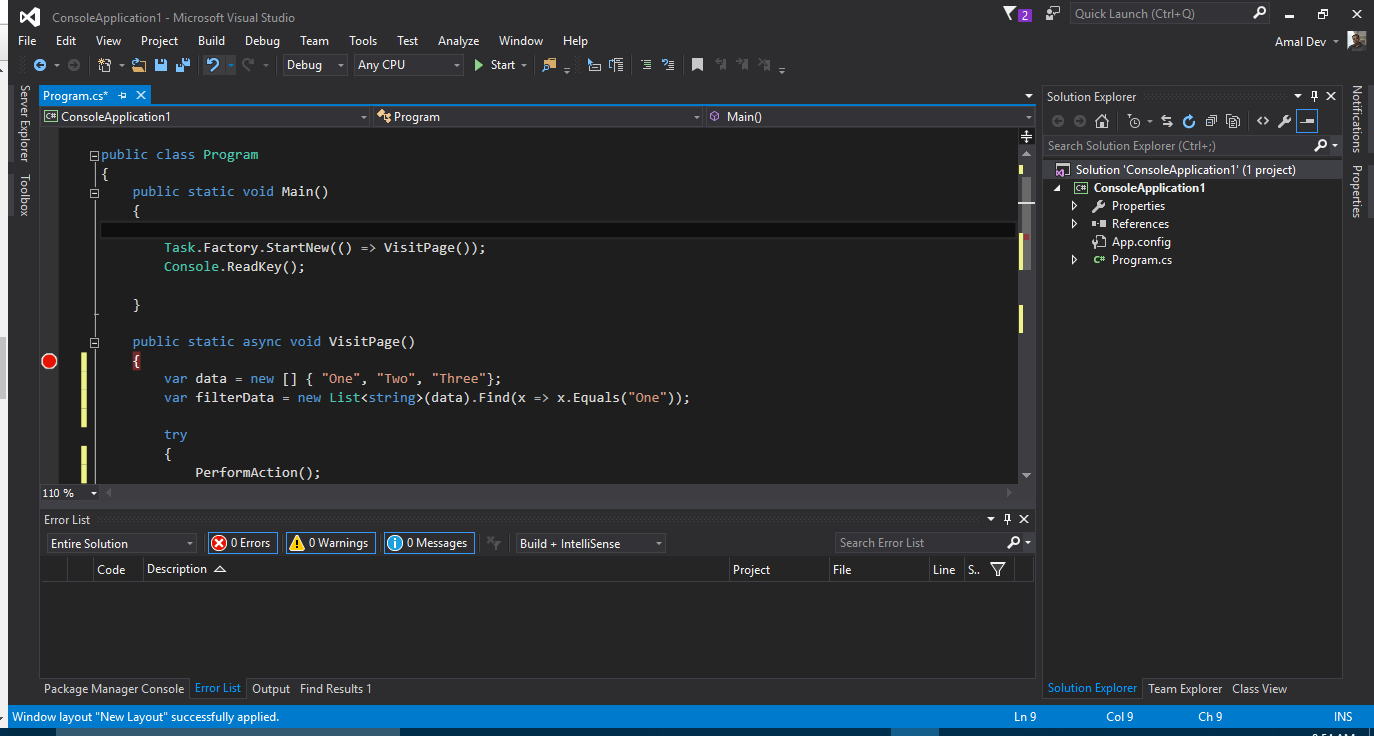 Let's see how we can manage layouts using Visual Studio. I prefer to have least tabs open in the IDE and likes have the code editor uses most of the layout. So I have closed all the open tabs in the right side as well as in the bottom.