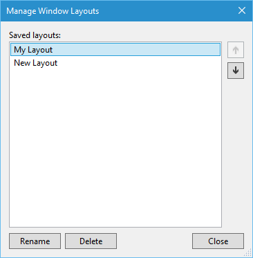 You can use the Manage Window Layouts menu item to perform actions such as deleting a saved layout, renaming the saved ones and rearranging the sort order.