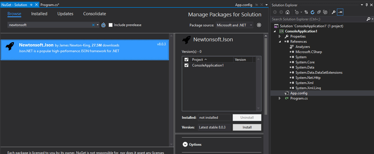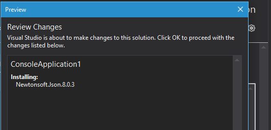 Search for newtonsoft in the Browse tab. Select Newtonsoft.Json from the search result, If you solution has got multiple projects, option is there to select the projects which needs Json.NET. Once you click the install button, a dialog will be shown with the summary.